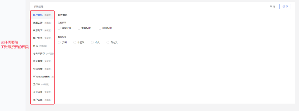 3.权限管理:想要给这些成员配置什么权限,点击勾选就行。没有勾选的,成员是没这个权限的。后期想要更改权限也可以直接在权限管理操作。
