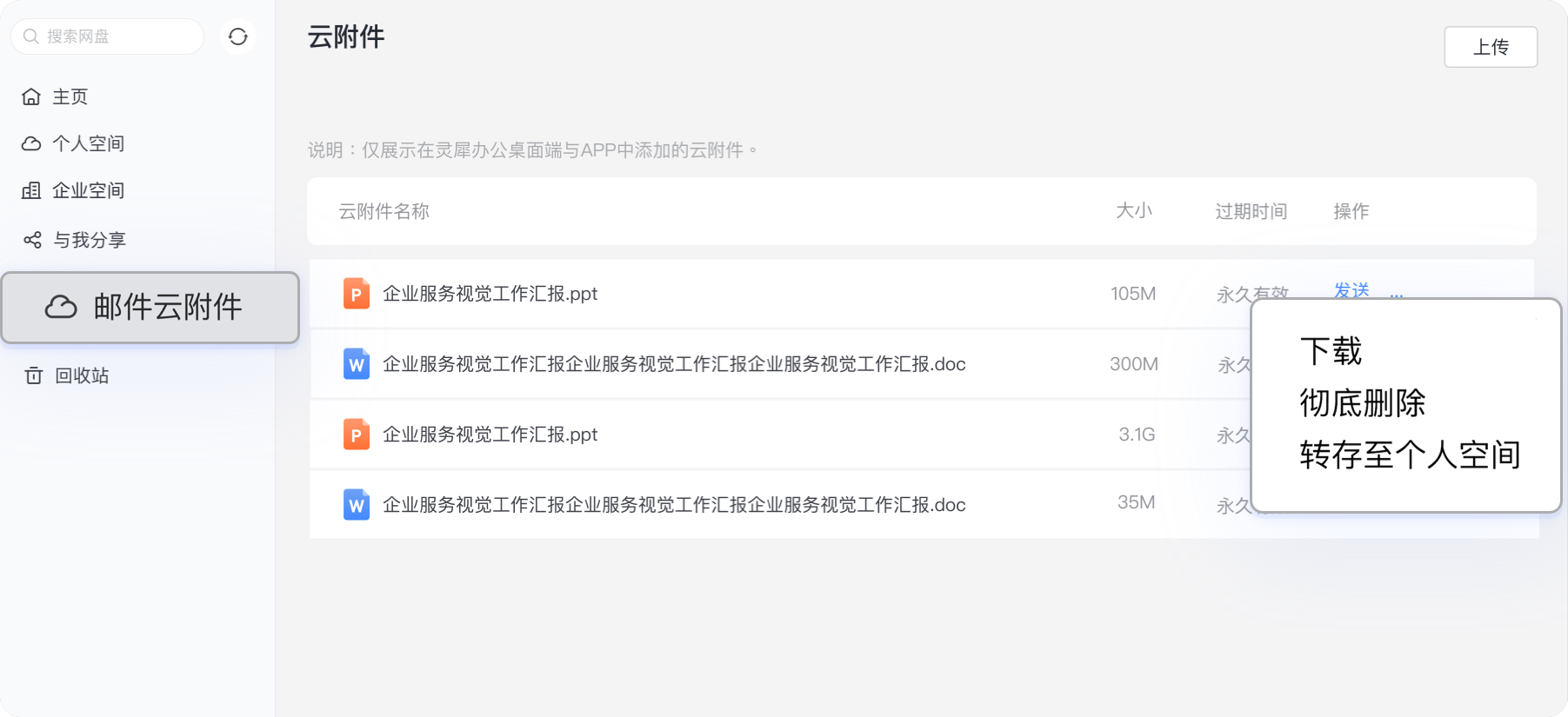 在灵犀办公桌面端-云文档-邮件云附件菜单下,将过往不再需要的云附件删除,以释放灵犀办公云附件空间,进而可以上传其他新的云附件文件并根据需求通过邮件发送。