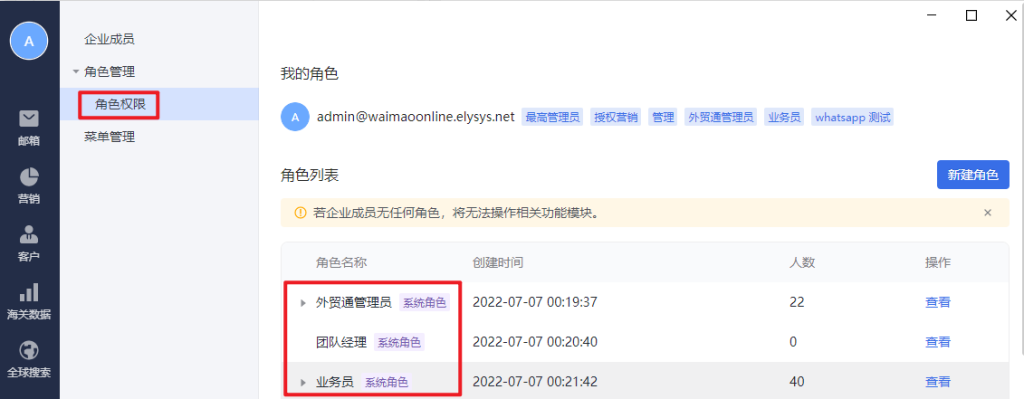 注意:只要管理后台设置了外贸通管理员,是可以自动同步到外贸通管理员角色里面的。所以外贸通管理员是只可以查看不可以添加帐号。团队经理和业务员是可以直接添加帐号