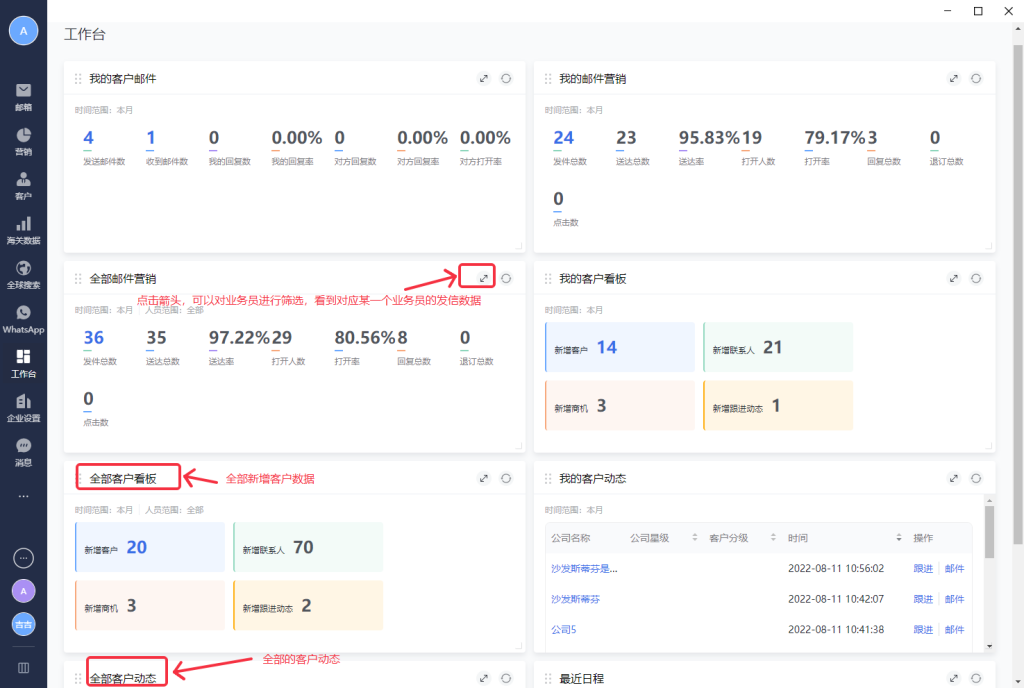 工作台除了邮件的发送数据外,还能看到更多的信息,可以更好的监控成员的业务状况