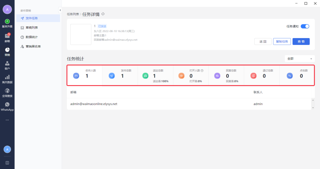1.2点击营销按钮→数据统计→全部数据界面可以看到给具体某一个客户发送邮件的数据