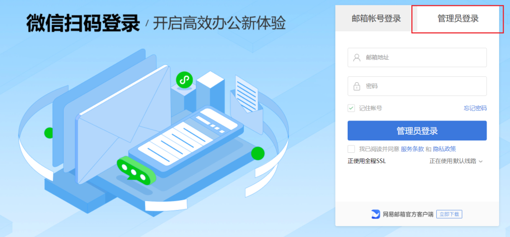 1.请打开您的企业邮箱登录页,或登录官网https://qy.163.com/login/,选择管理员登录。