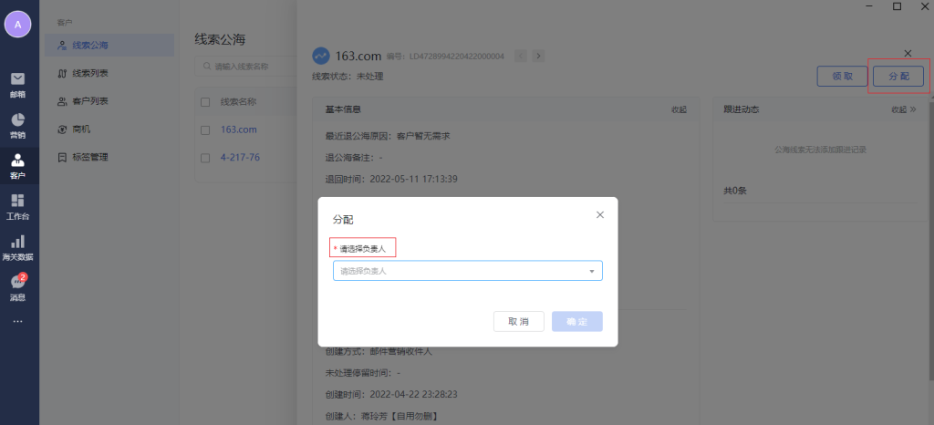 分配:分配公海数据到具体的负责人身上,分配后,数据进入线索列表,且负责人变为被分配人。