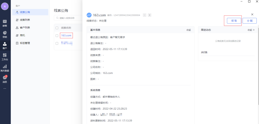 领取:领取公海数据,到自己身上,领取后,数据进入线索列表,且负责人变为自己。