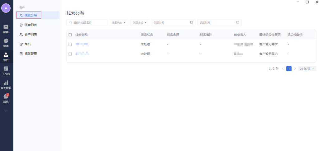 显示公海的线索数据,即没有“负责人”的线索数据。