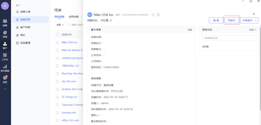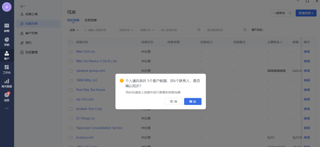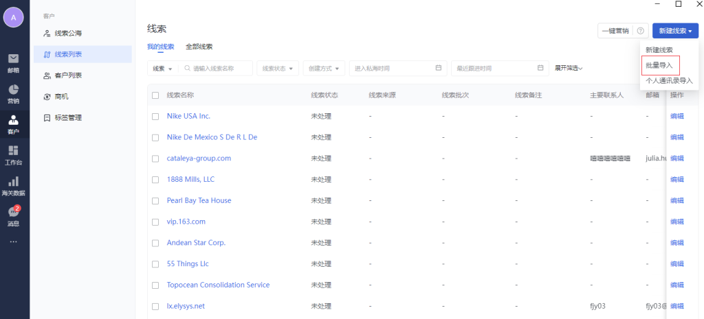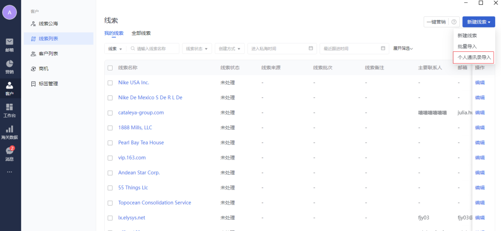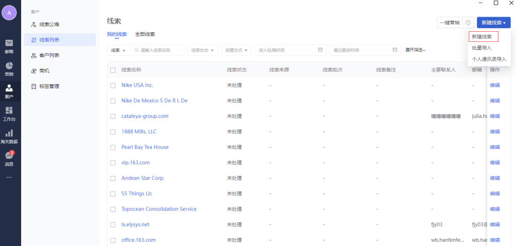 线索列表支持手动新建、海关数据导入、往来邮件推荐、个人通讯录导入、发送营销邮件时勾选自动同步营销邮件收件人到线索管理,并进行后续的更多管理操作。