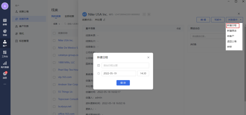 点击“新建日程”,可以新建日程,并且关联到当前的线索数据下。