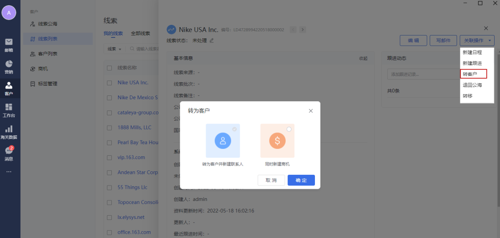 默认选中“转为客户并新建联系人”,在弹窗中填写客户、联系人信息后,可以完成新建。