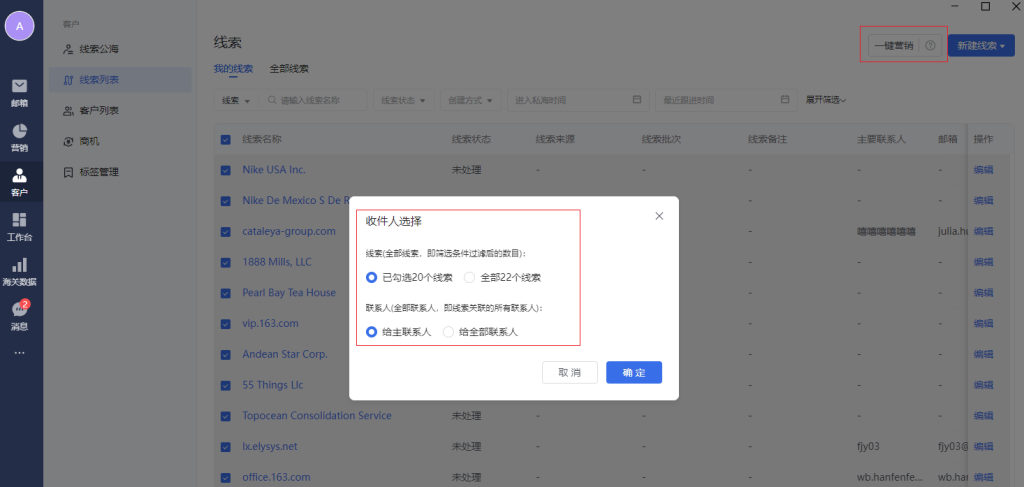 支持批量选择线索,并给线索关联的联系人,发送营销邮件。点击确定后会跳转到新建发件任务处。