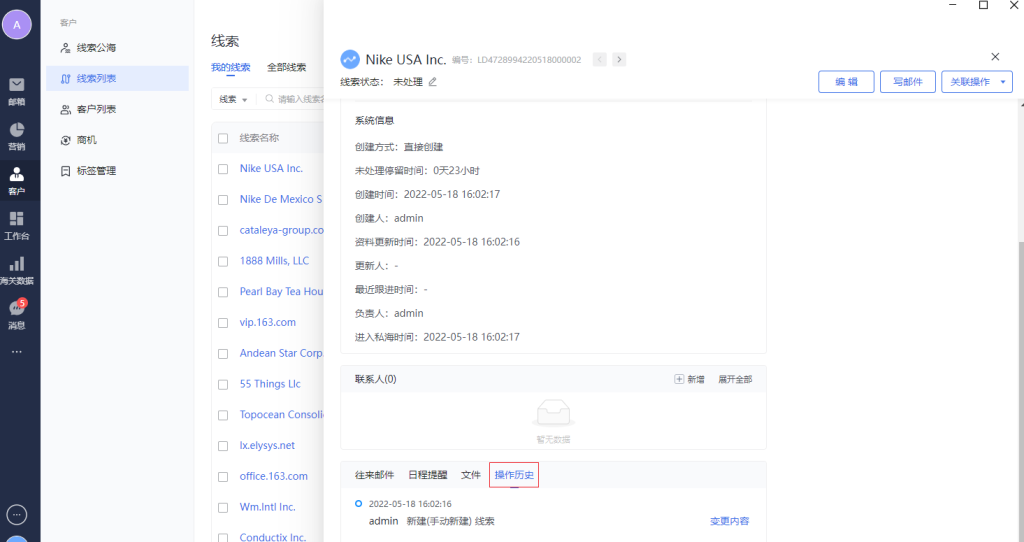 -操作历史的类型:新建(往来邮件推荐)、新建(个人通讯录导入)、新建(EDM收件人)、新建(手动新建) 、新建(批量导入)、编辑(手动编辑)、线索状态变更