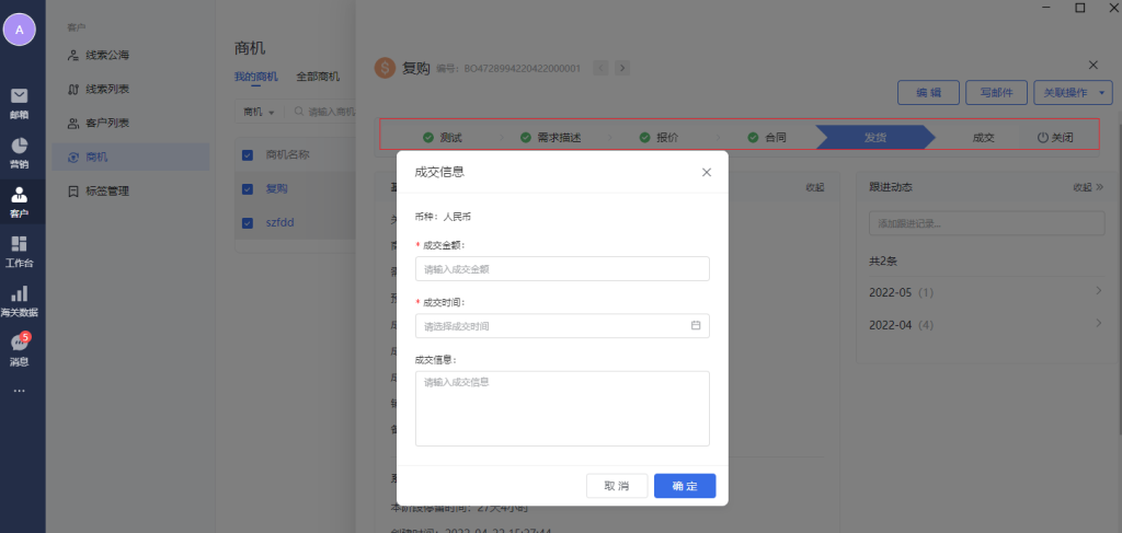 成交阶段,需要填写“成交金额”和“成交时间”。