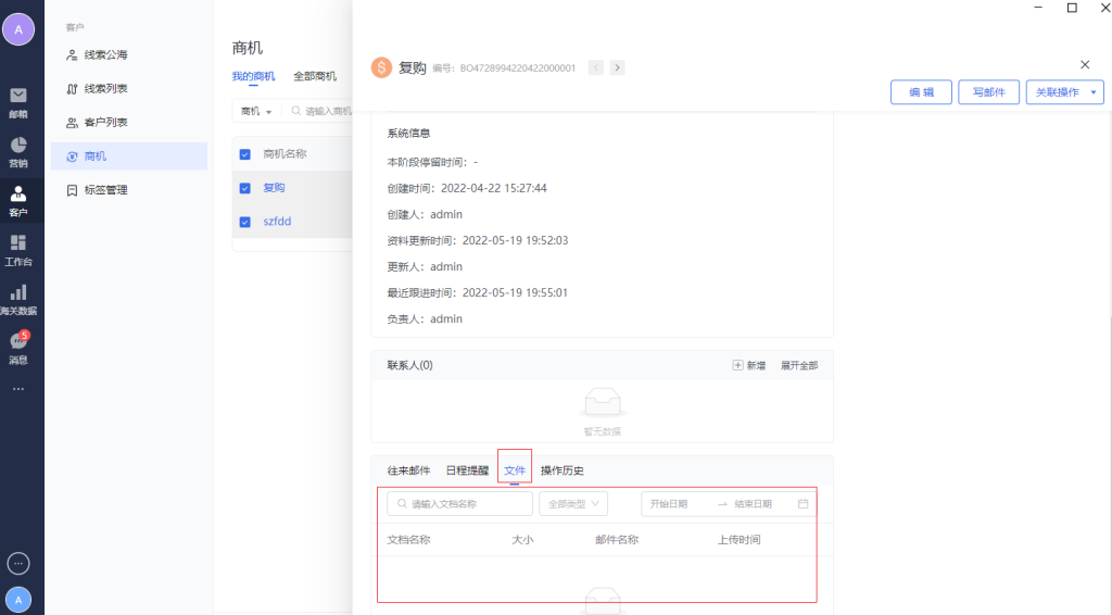 聚合商机的往来邮件、跟进记录里面的文档附件,沉底企业数字资产。