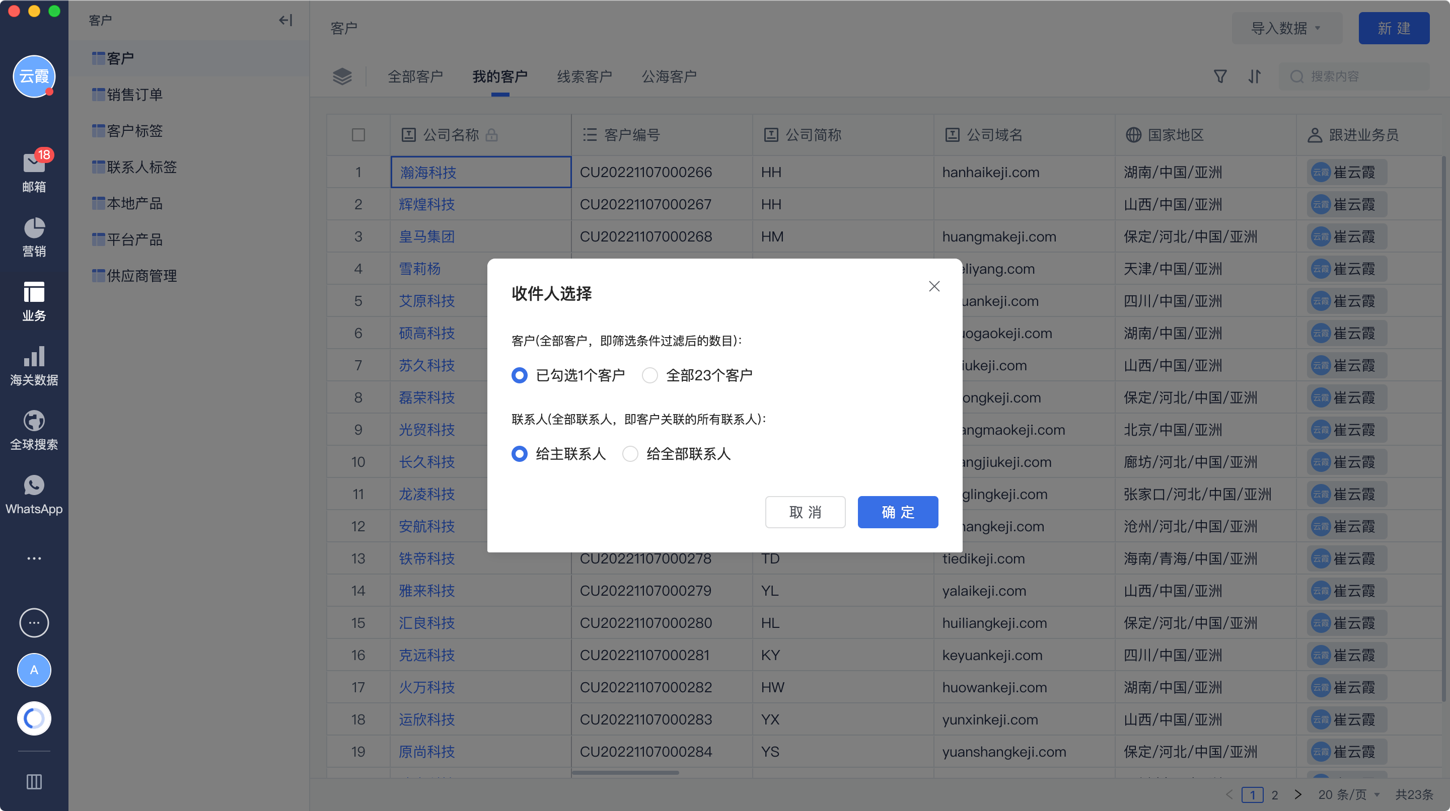 在客户列表选中客户数据或者在客户详情页直接点击「一键营销」按钮,确认发送营销邮件的联系人,确定后进入营销发信流程。