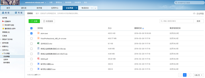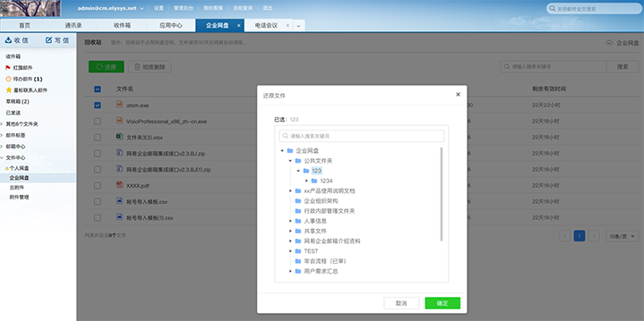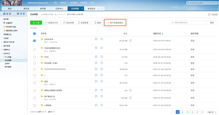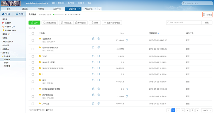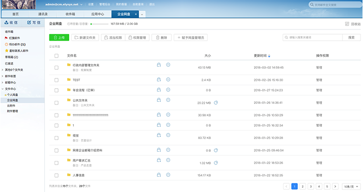 从“WebMail-文件中心-企业网盘”路径可进入企业网盘功能,如下图所示。