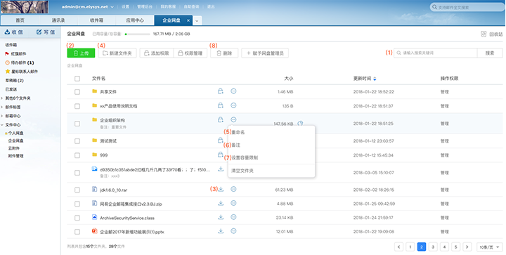 上传文件、下载文件、重命名文件(夹)、删除文件(夹)、清空文件夹、备注文件(夹)、添加权限、删除权限、修改权限、分配文件夹容量限制 b.下载权限:可预览文件、下载文件 c.上传权限:可上传文件、对于自己上传的文件可以下载、删除、重命名、备注2、 权限管理相关操作说明