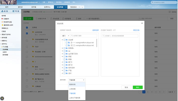 a.添加权限:具有某文件夹管理权限的成员,可下发该文件夹的管理权限、下载权限、上传权限给企业其他成员。可按部门为单位添加(即部门新增或减少成员,会动态给新成员添加权限或离职成员删除业其他成员。可按部门为单位添加(即部门新增或减少成员,会动态给新成员添加权限或离职成员删除权限),也可直接为成员添加,如下图所示。