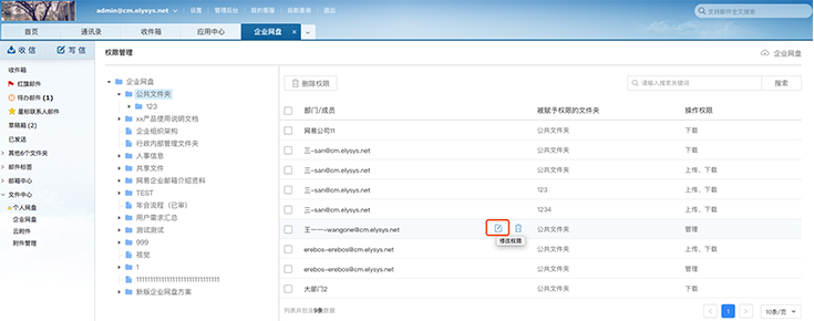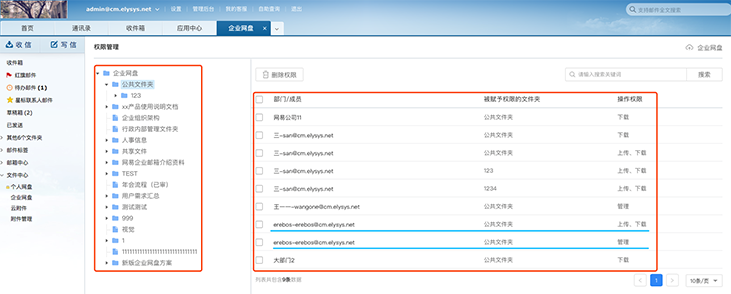 例如:如上图所示,erebos- erebos@cm.elysys.net分两次被赋予对公共文件夹的上传/下载权限和管理权限。
