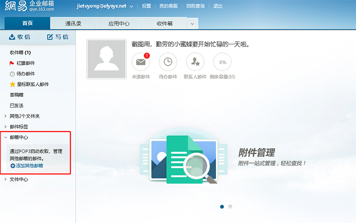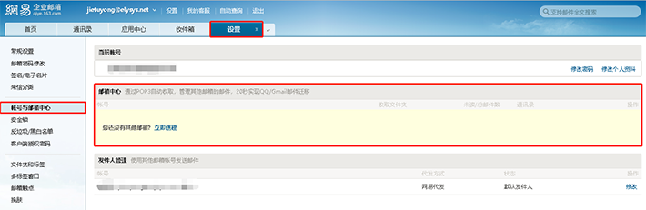 登录Webmail端企业邮箱后,点击邮箱首页左侧栏的“邮箱中心”或通过点击邮箱首页顶部栏的“设置”,选择常规设置,在左侧栏点击“帐号与邮箱中心”均可进入迁移其他邮箱页面。