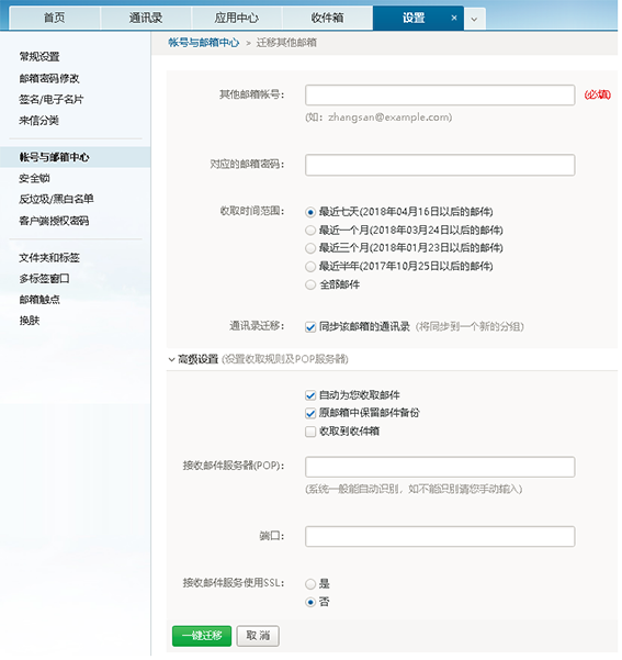 在“迁移其他邮箱页面”,您只需要输入被迁移邮箱的地址和密码即可,系统会自动识别您当前登录邮箱的POP服务器地址和端口。
